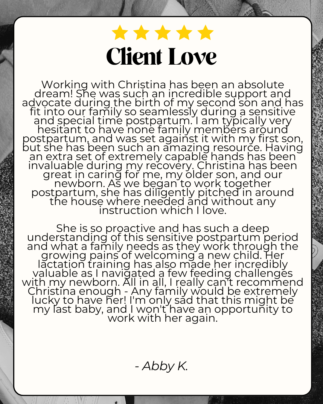 Postpartum Doula (available for 24/7 care, overnights, days, and for travel clients)